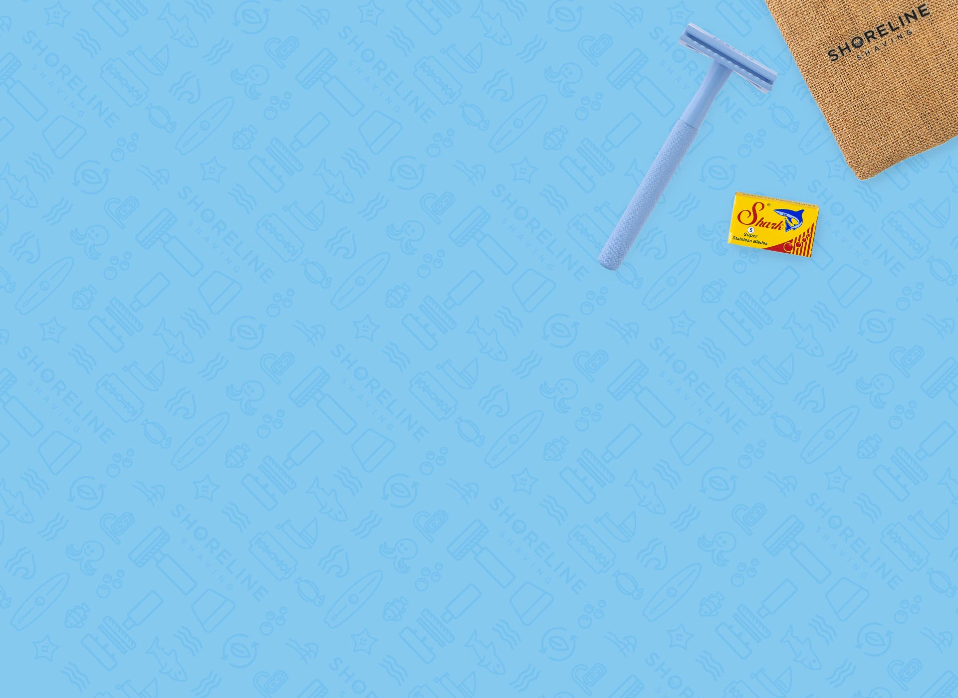 Sustainable shaving kit with pale blue safety razor, shaving soap, hessian bag and blades - Shoreline Shaving